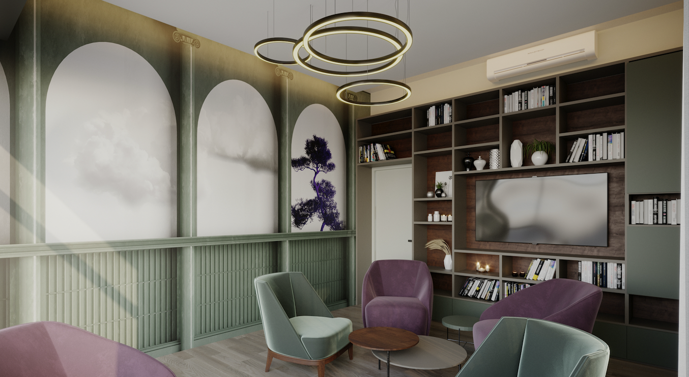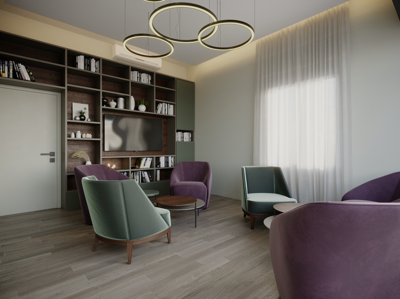 Per arricchire di più l’atmosfera abbiamo sostituito le sedie con sei poltroncine di due forme diverse firmate Gienne e tavolini con altezze diverse che, all’occorrenza, fanno spazio a un tavolo da riunioni allungabile, ricavato da una piccola consolle. I toni scelti sono quelli del verde, del sabbia, dell’olmo termotrattato con un accento di lilla.