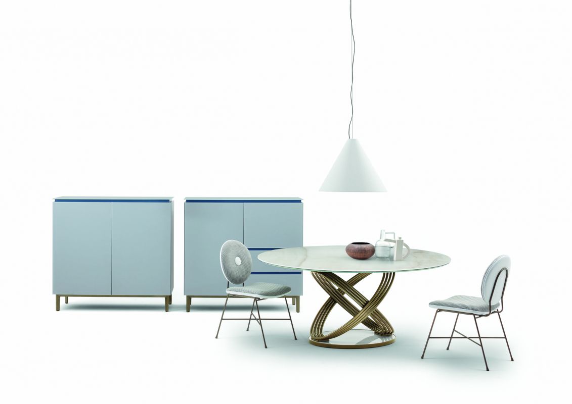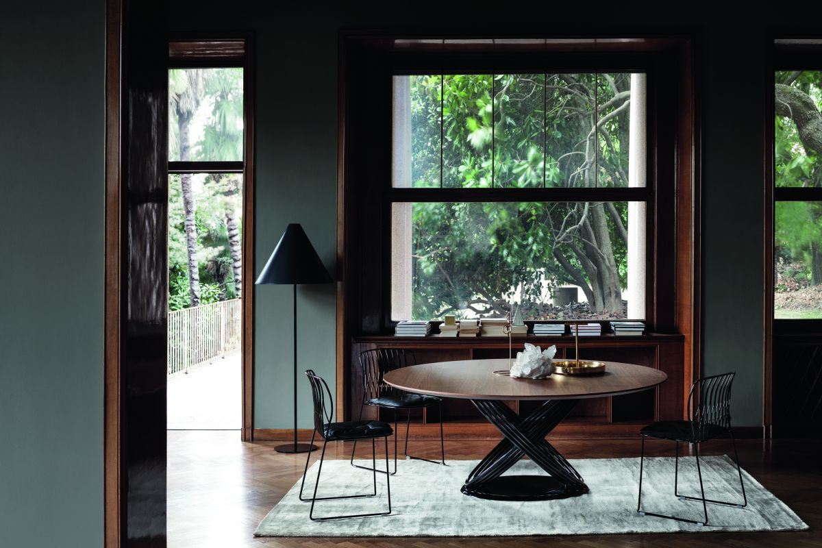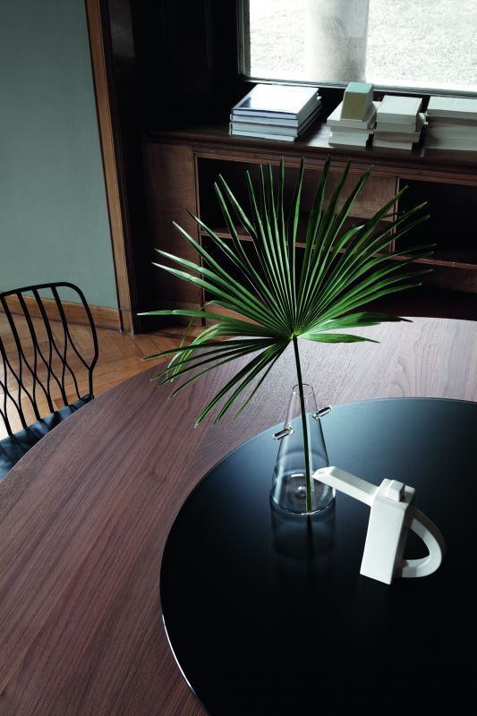 Tavolo rotondo fisso con struttura in acciaio laccato. Base in acciaio laccato, legno impiallacciato o SuperMarmo. Piano in legno impiallacciato, cristallo, cristallo antigraffio, SuperMarmo.