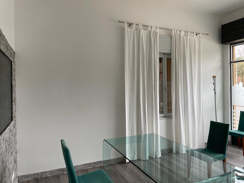 Infine la tenda, essenziale ma elegante, scelta in collaborazione con la tappezzeria Pavesi Gorizia, che scende morbida dal controsoffitto e riscalda l’ambiente.
