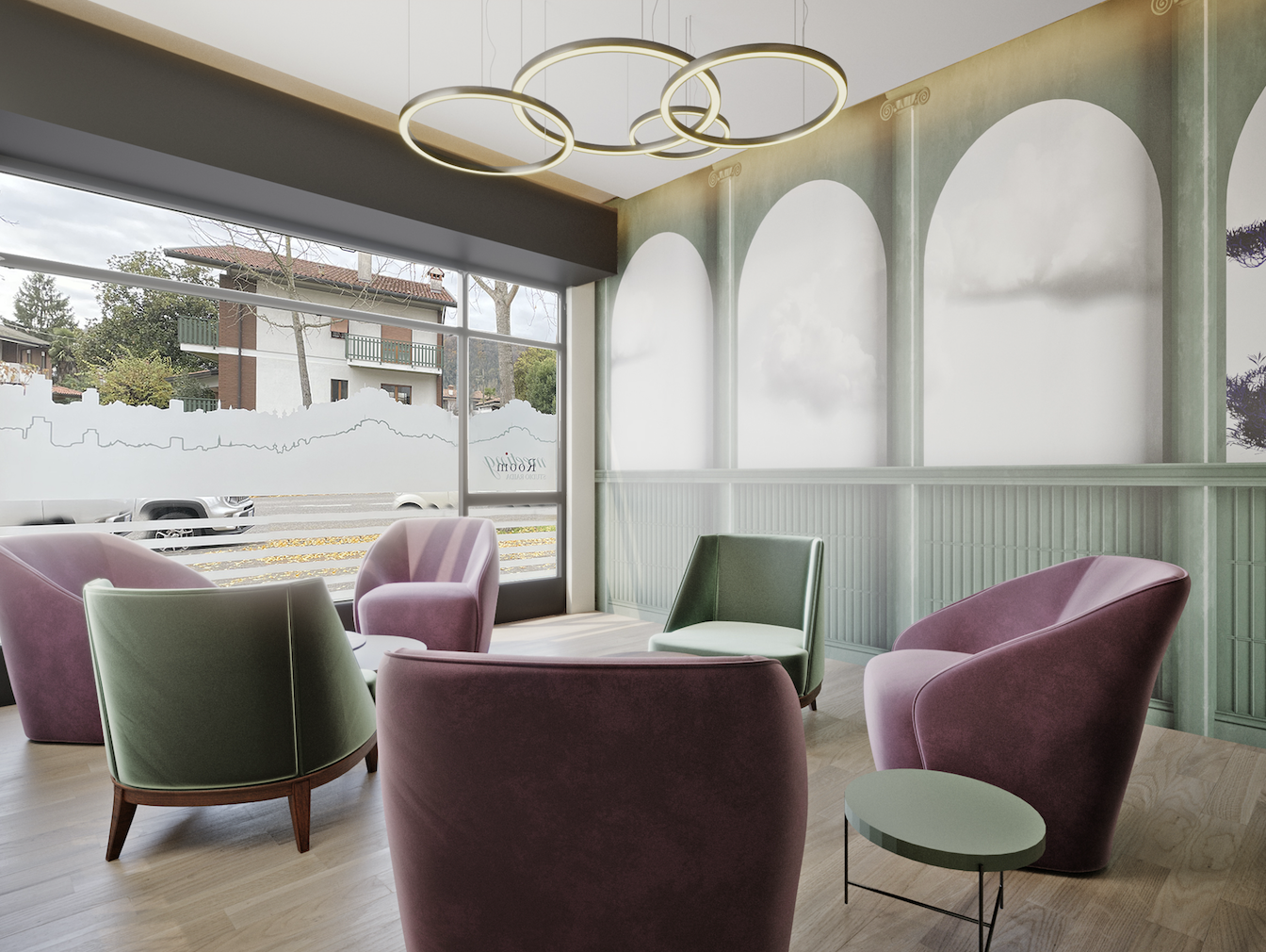 Per arricchire di più l’atmosfera abbiamo sostituito le sedie con sei poltroncine di due forme diverse firmate Gienne e tavolini con altezze diverse che, all’occorrenza, fanno spazio a un tavolo da riunioni allungabile, ricavato da una piccola consolle. I toni scelti sono quelli del verde, del sabbia, dell’olmo termotrattato con un accento di lilla.